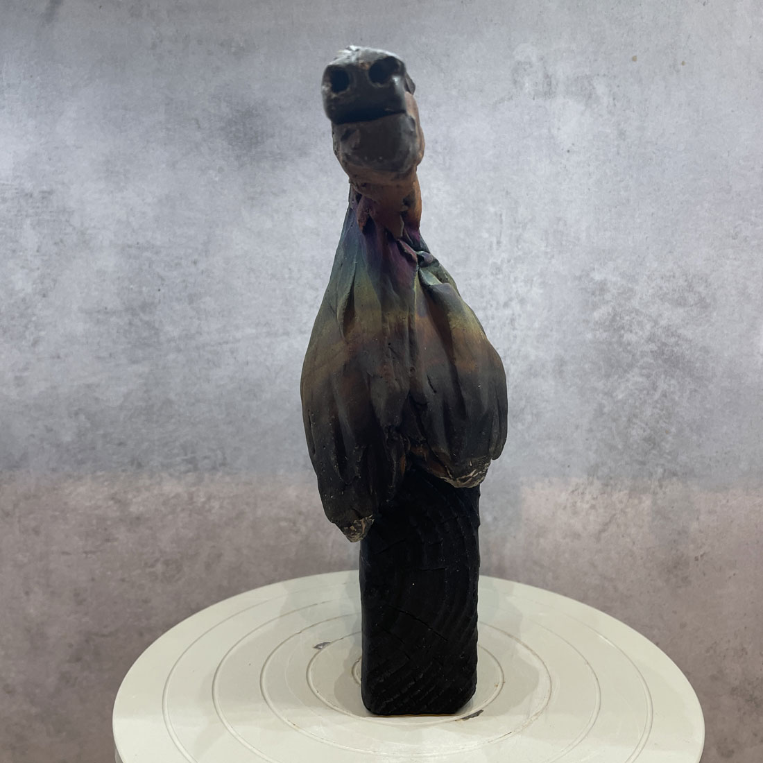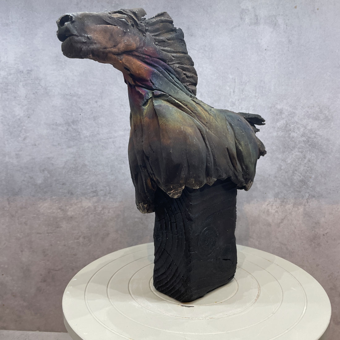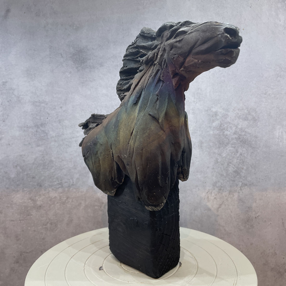 Rakubränd häst på svart fot i trä. Hästen är oglaserad och har en matt yta. De regnbågsskimrande färgerna har Jonas fått fram genom en teknik där man använder bensin. Foten är i trä och behandlad med tekniken shou sugi ban.