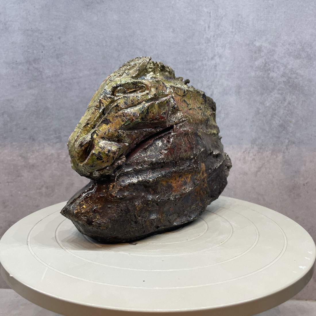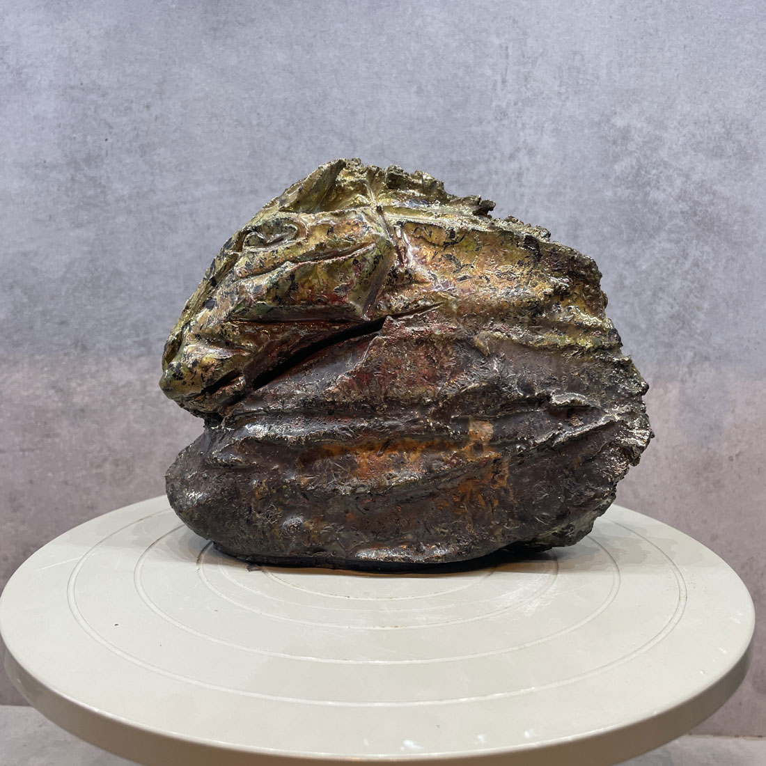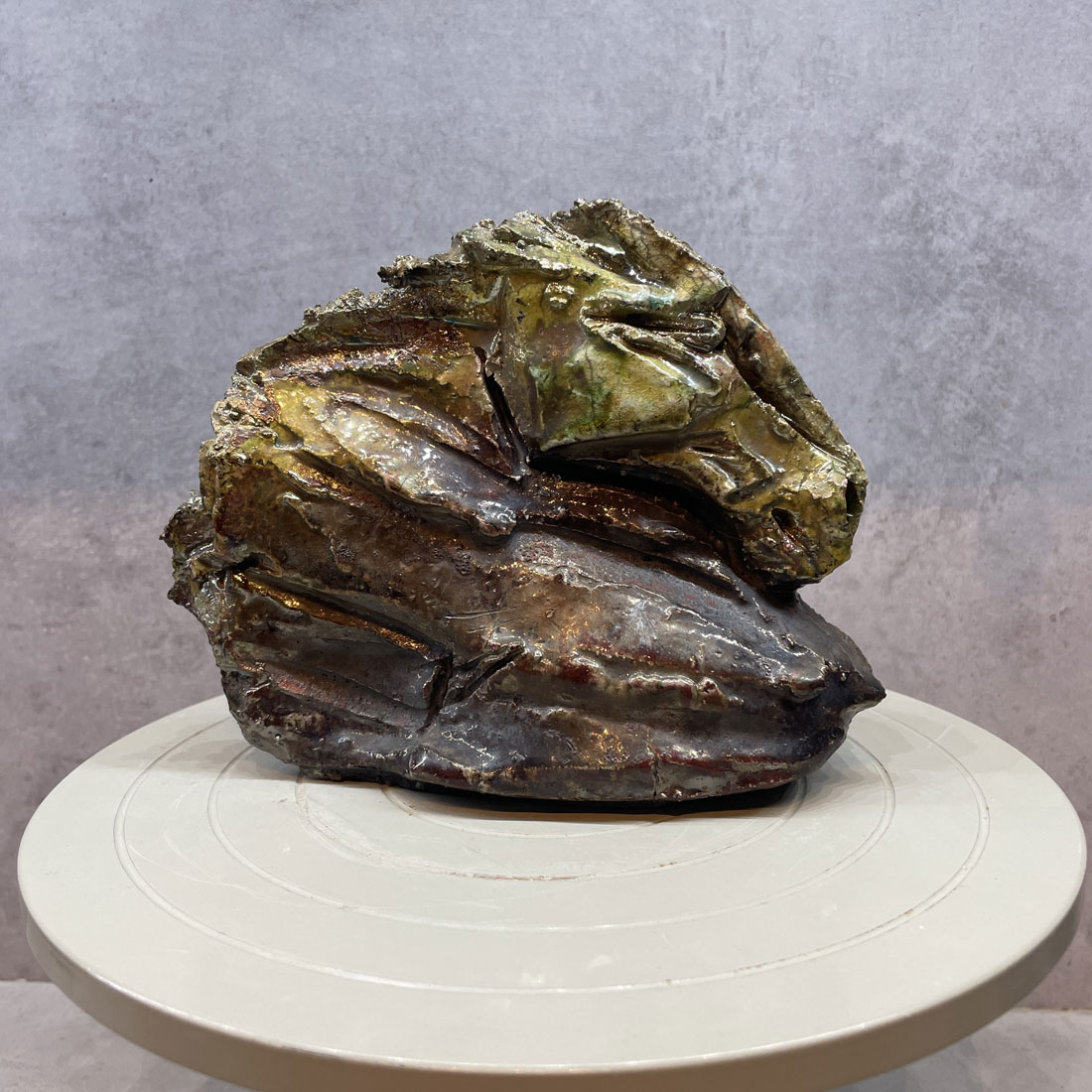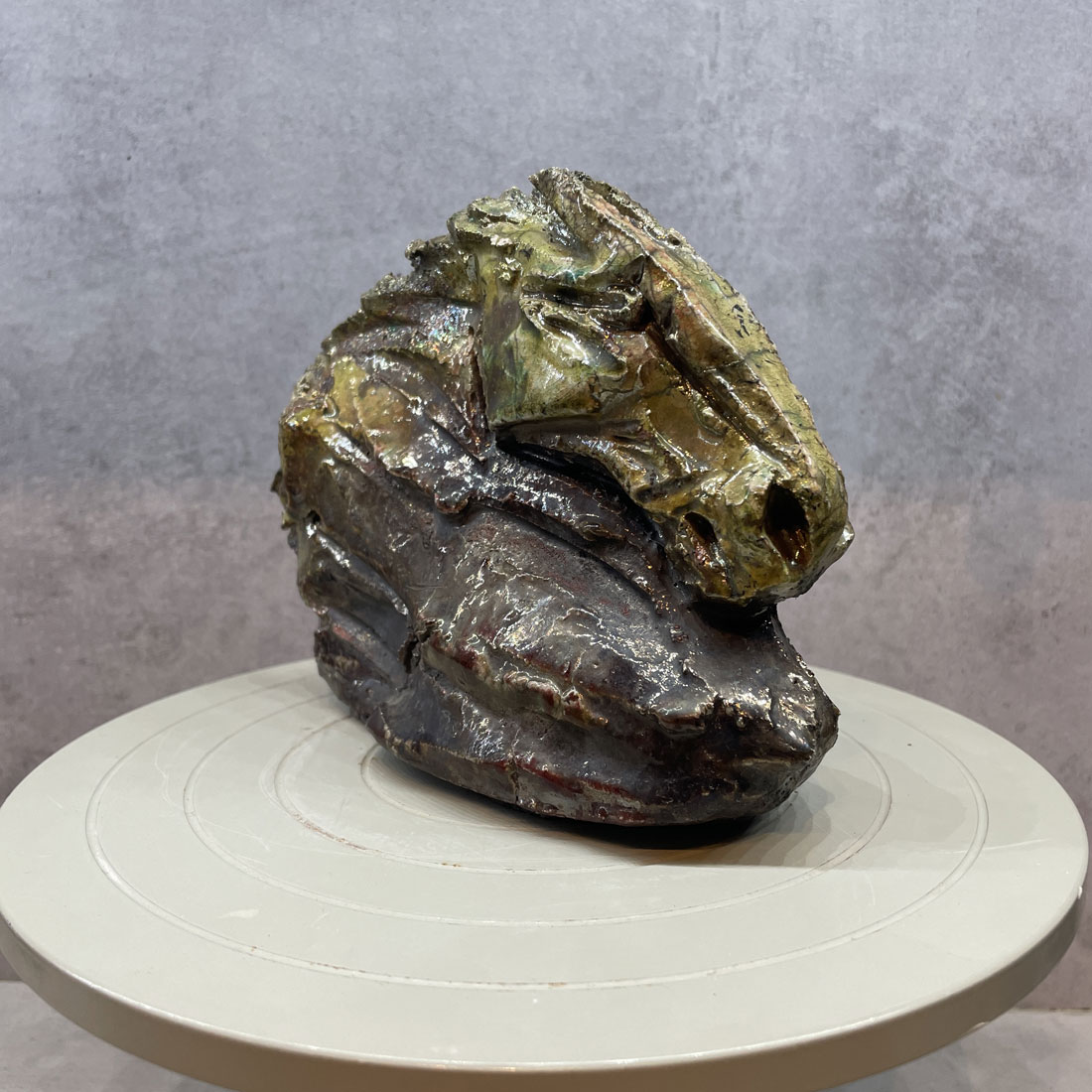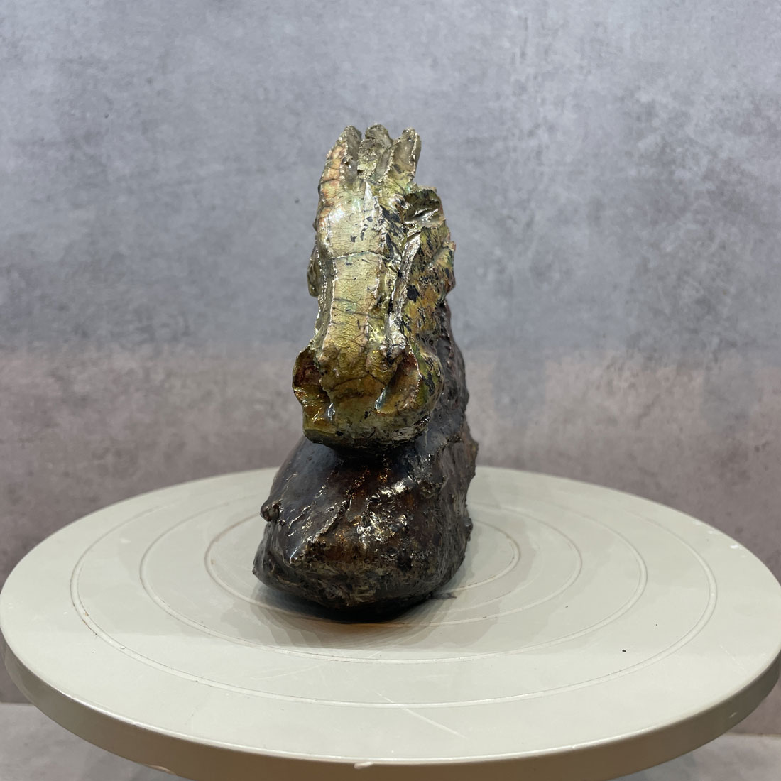 Rakubränd häst ”Oden” i guldmelerad glasyr.