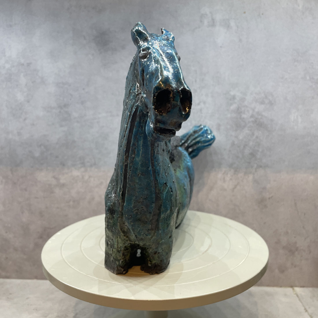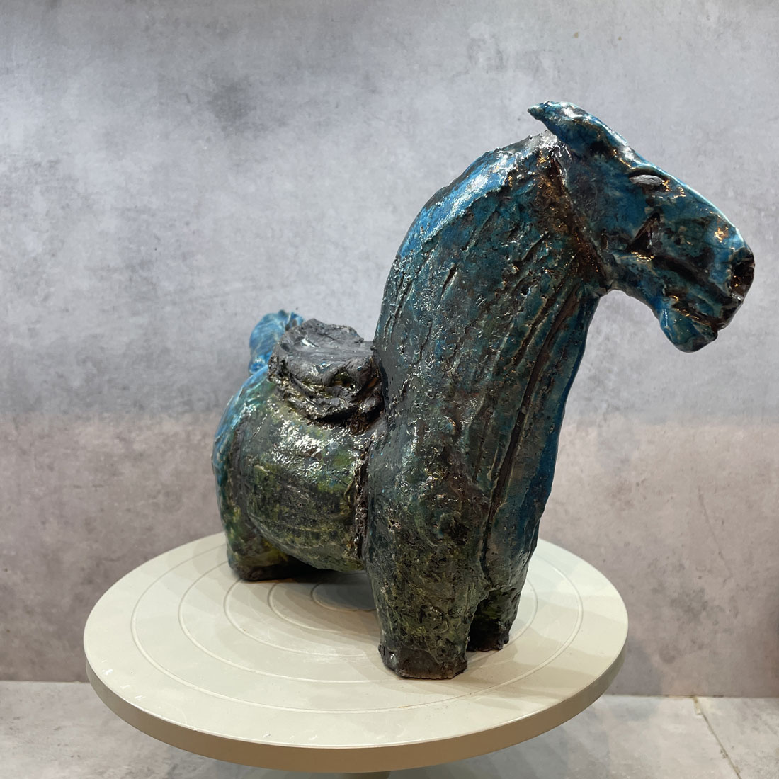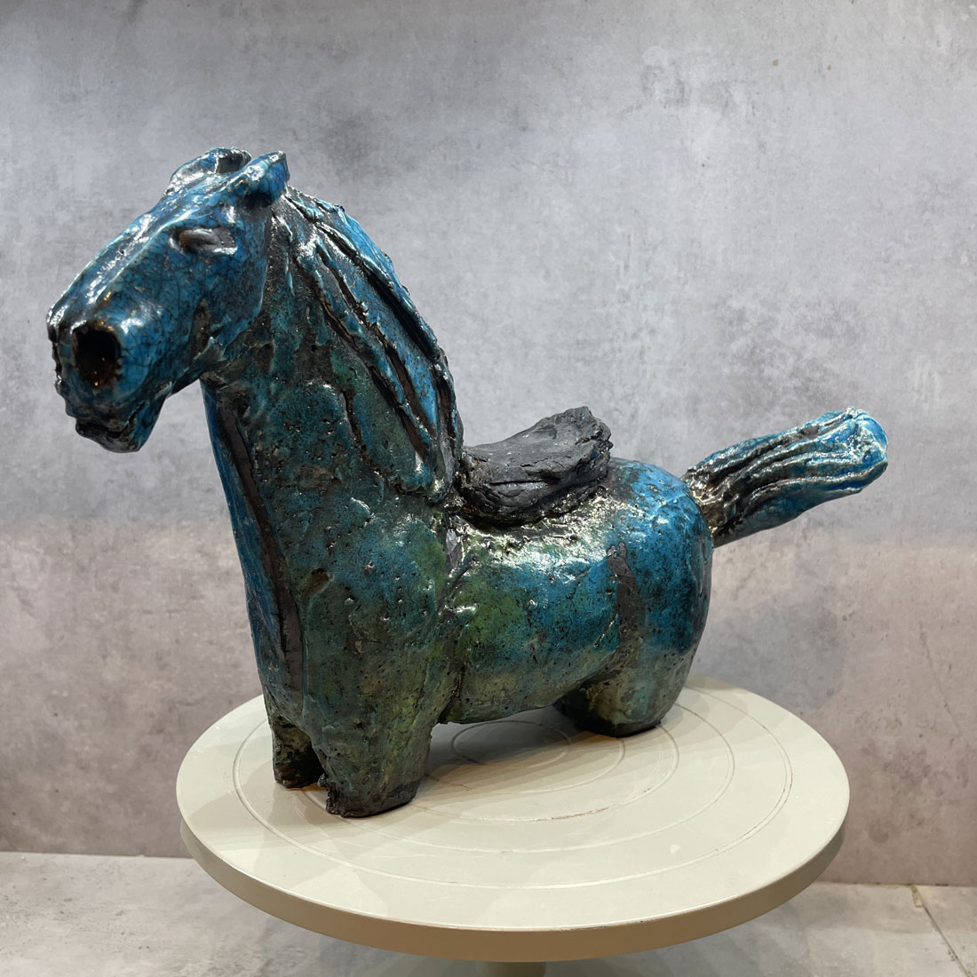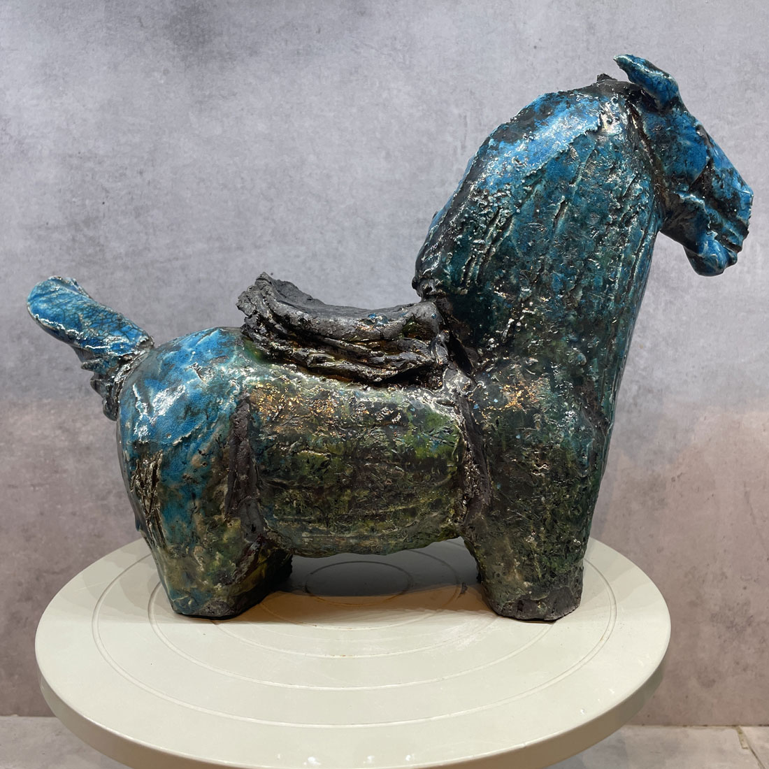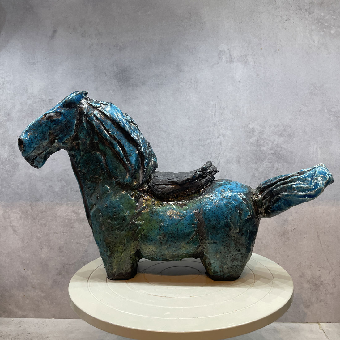 Rakubränd häst i turkos glasyr och svart sadel.