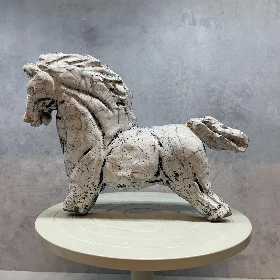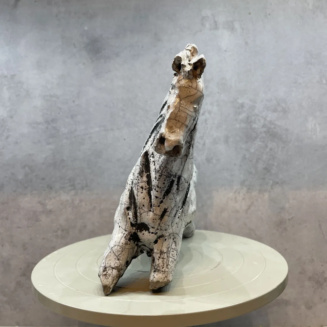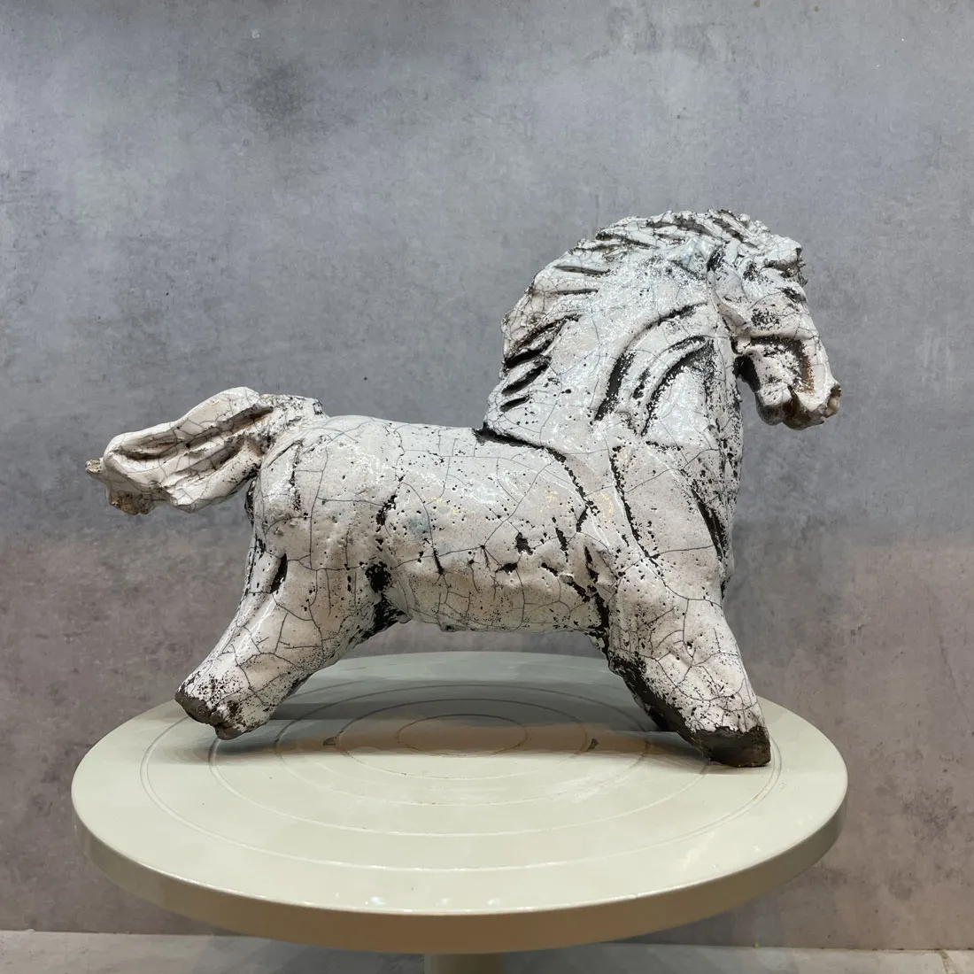 Rakubränd häst i vit glasyr.
